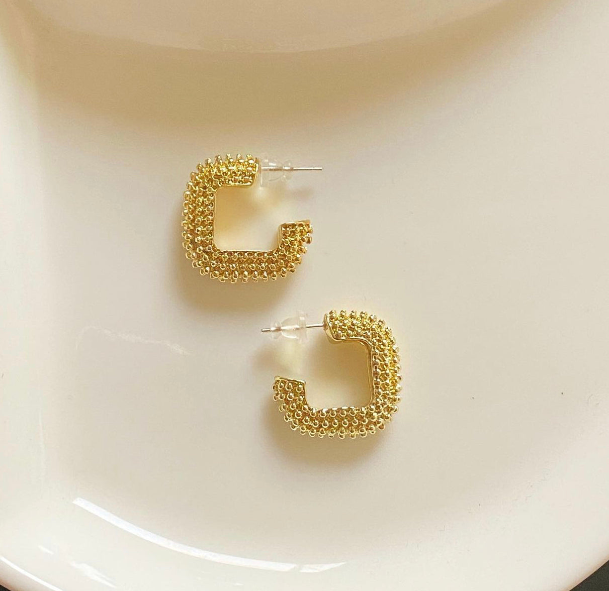 Gold plated scaly textured hoops, perfect for styling your solid outfits.